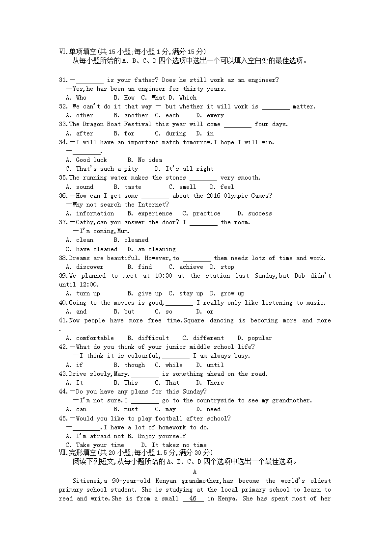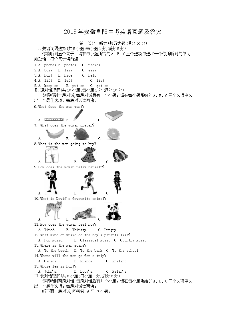 【文档名称】 2015年安徽阜阳中考英语真题及答案(Word版).doc