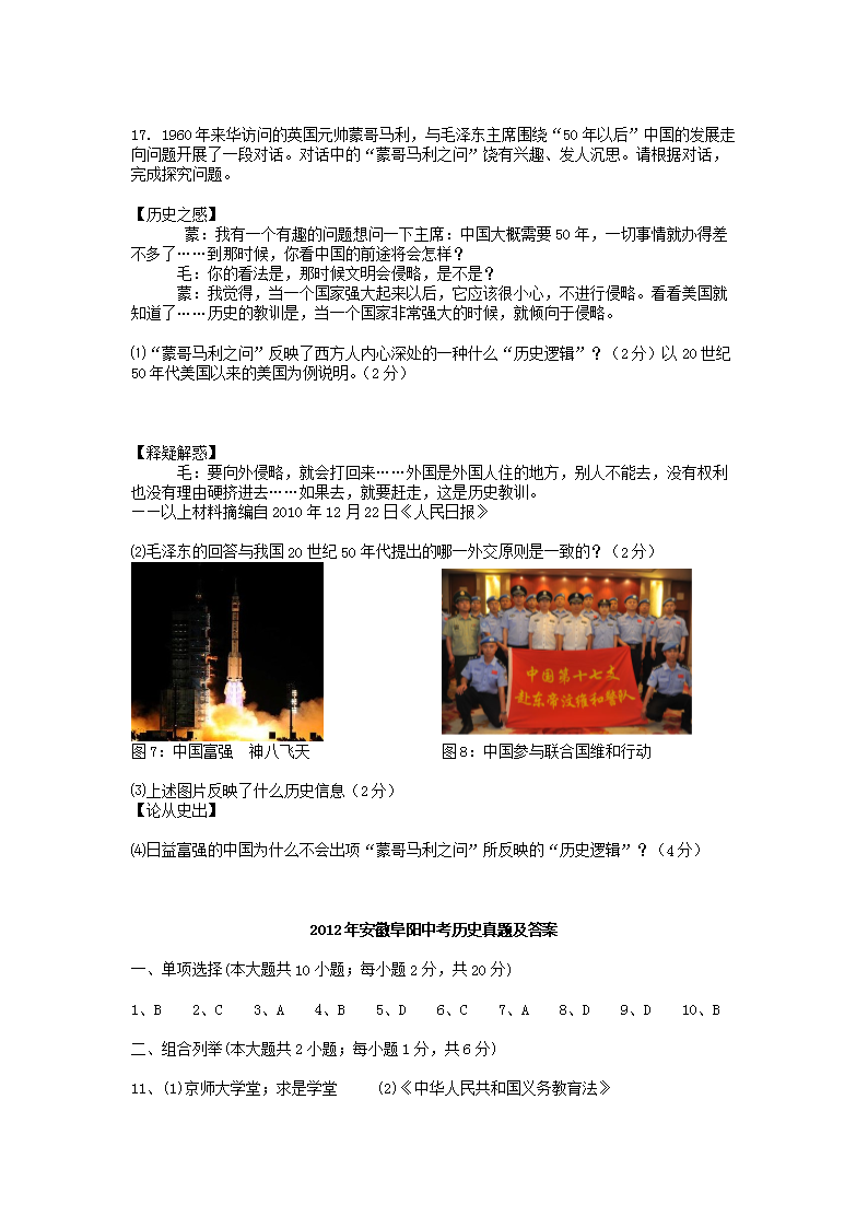 【文档预览】 无忧考网整理发布2012年安徽阜阳中考历史真题及答案(Word版),前五页预览如下: