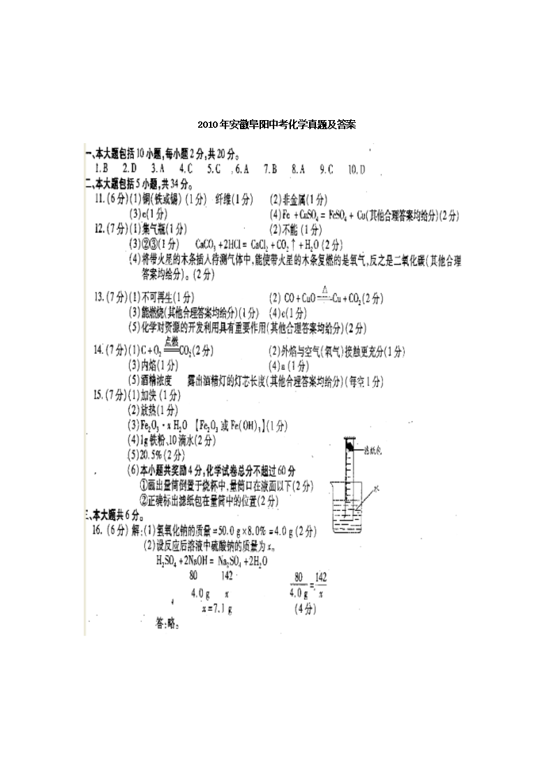 【文档名称】 2010年安徽阜阳中考化学真题及答案(Word版).doc