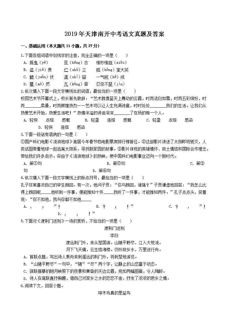 【文档名称】 2019年天津南开中考语文真题及答案(Word版).doc