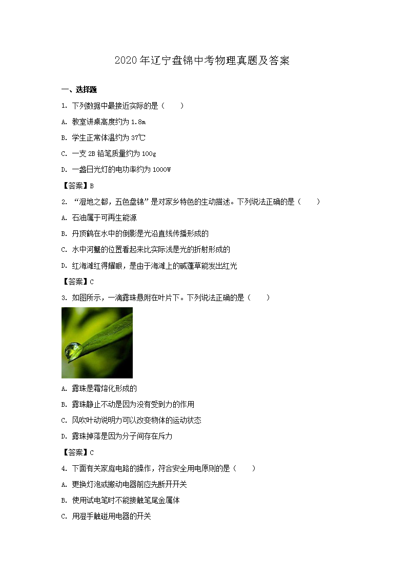 【文档预览】 无忧考网整理发布2020年辽宁盘锦中考物理真题及答案(Word版),前五页预览如下: