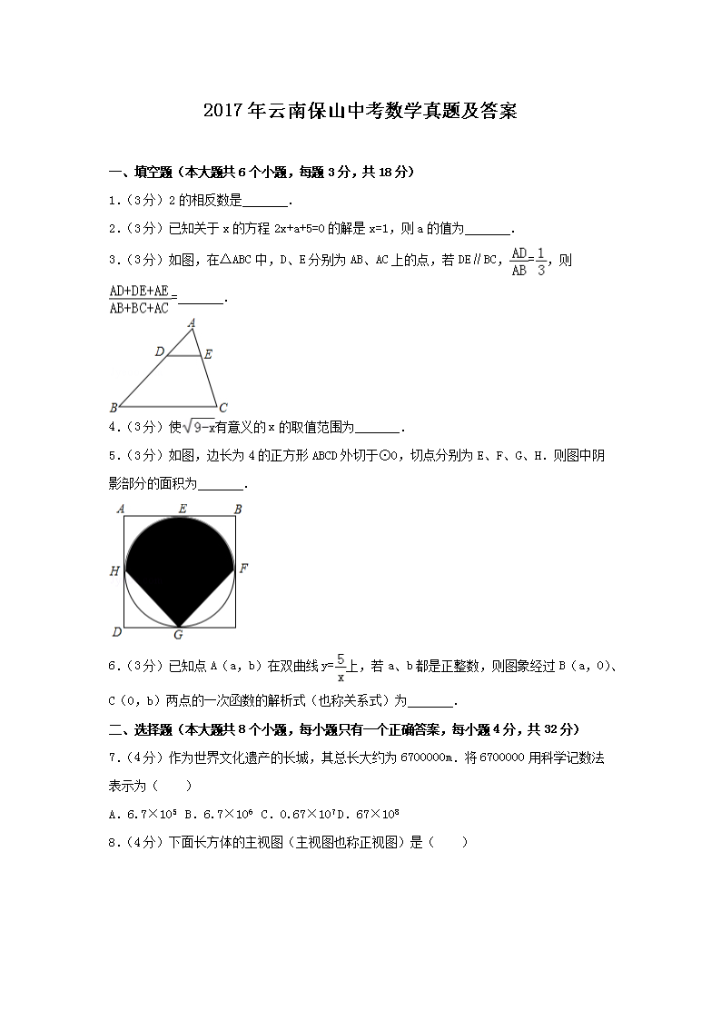 【文档名称】 2017年云南保山中考数学真题及答案(Word版).doc