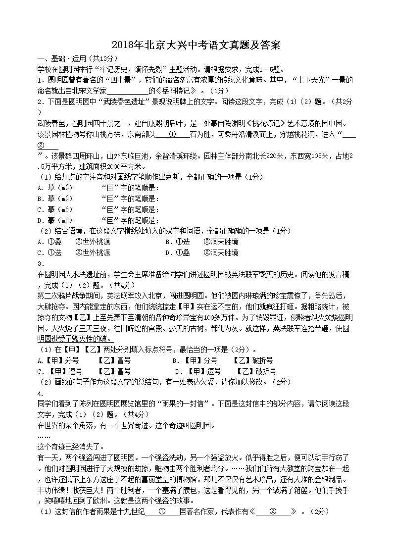 【文档名称】 2018年北京大兴中考语文真题及答案(Word版).doc