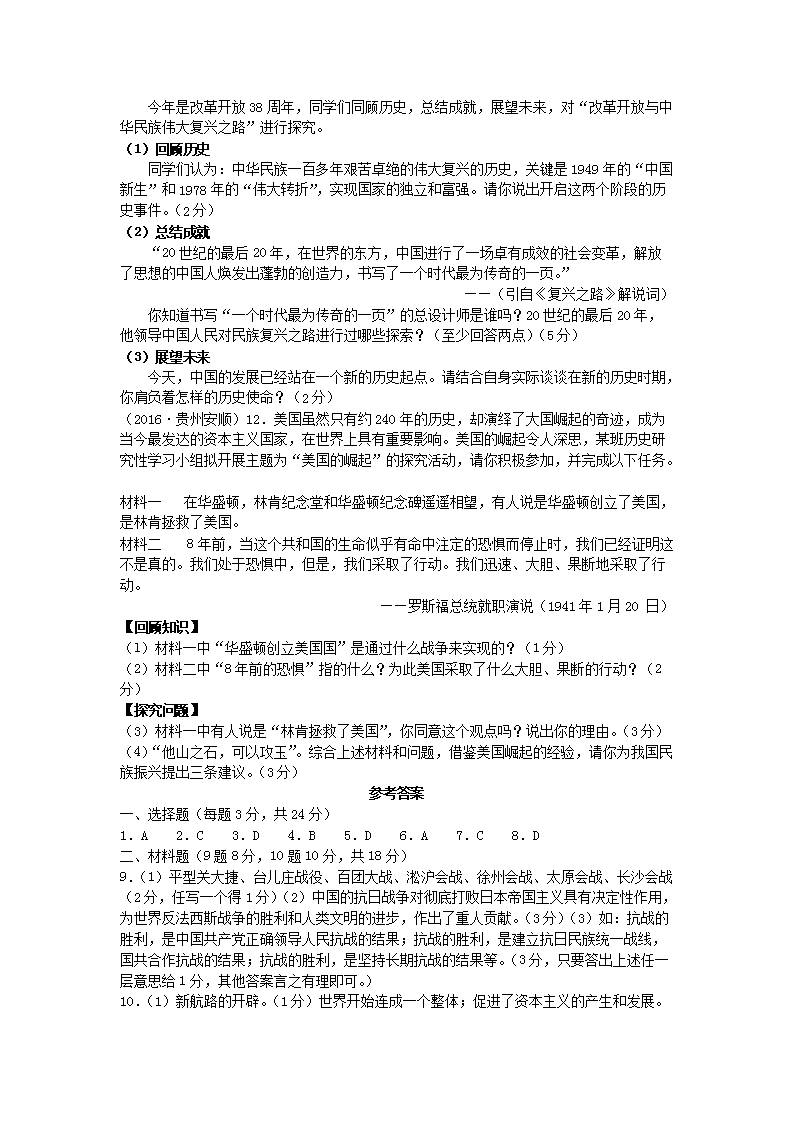 【文档名称】 2016年贵州安顺中考历史真题及答案(Word版).doc