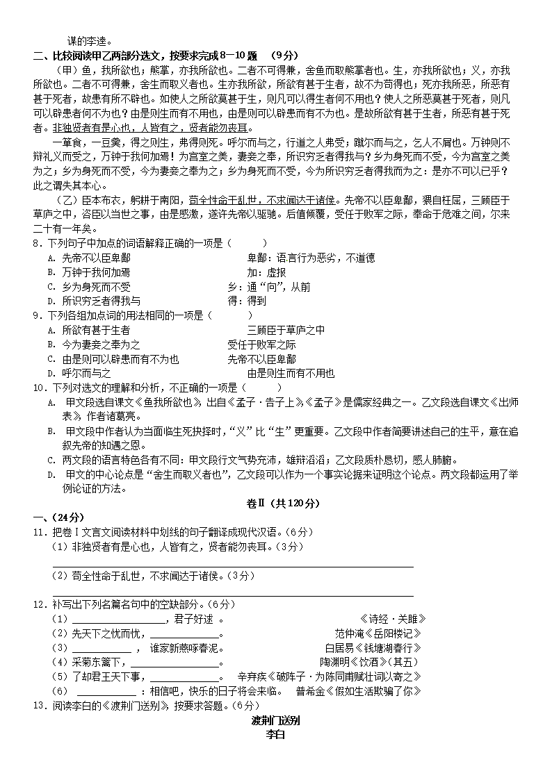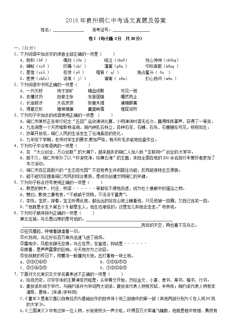 【文档名称】 2016年贵州铜仁中考语文真题及答案(Word版).doc