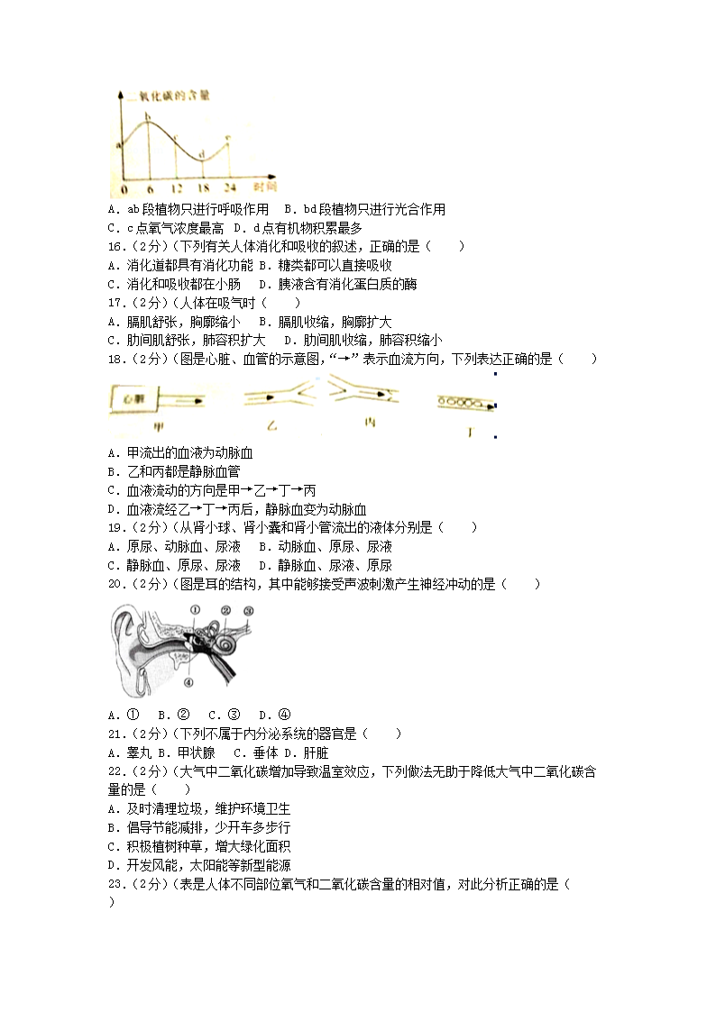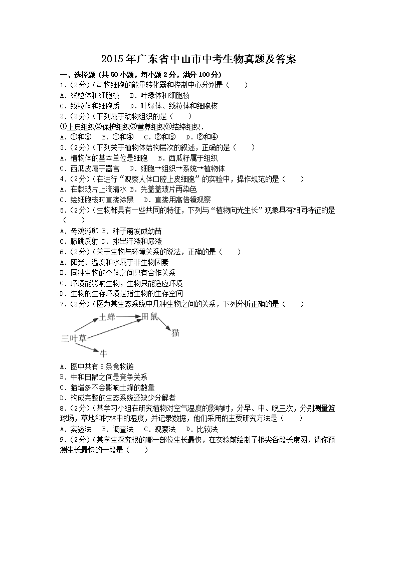 【文档名称】 2015年广东省中山市中考生物真题及答案(Word版).doc