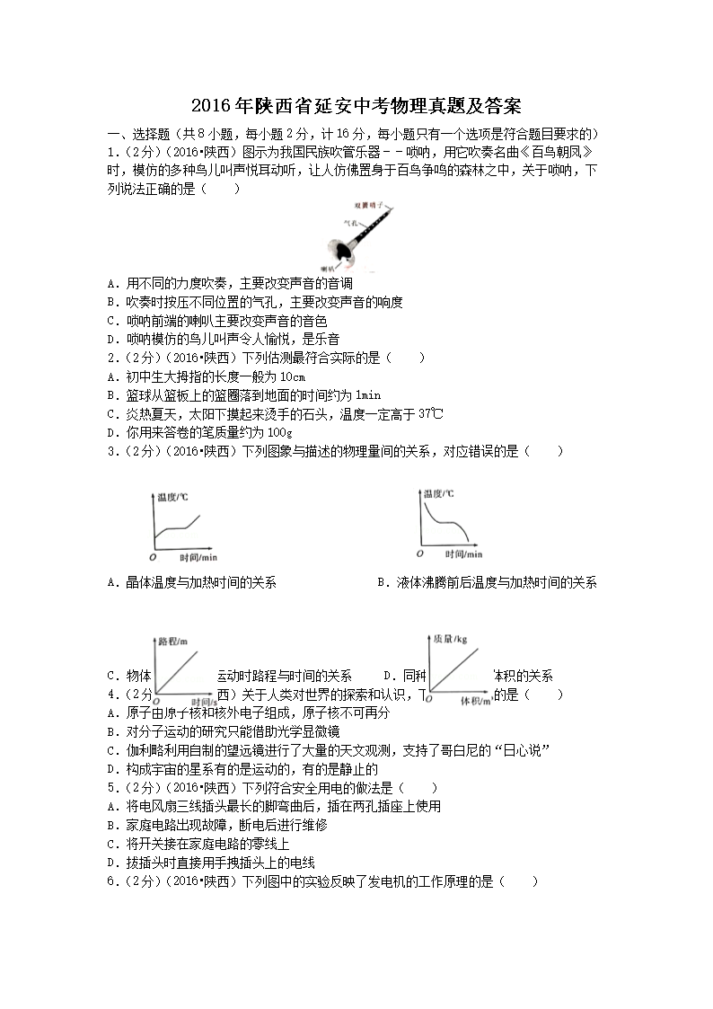 【文档名称】 2016年陕西省延安中考物理真题及答案(Word版).doc