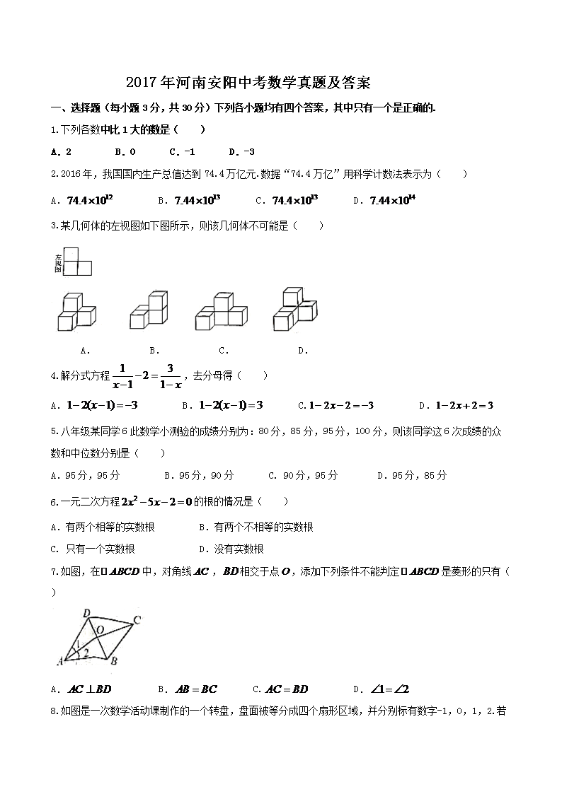 【文档名称】 2017年河南安阳中考数学真题及答案(Word版).doc