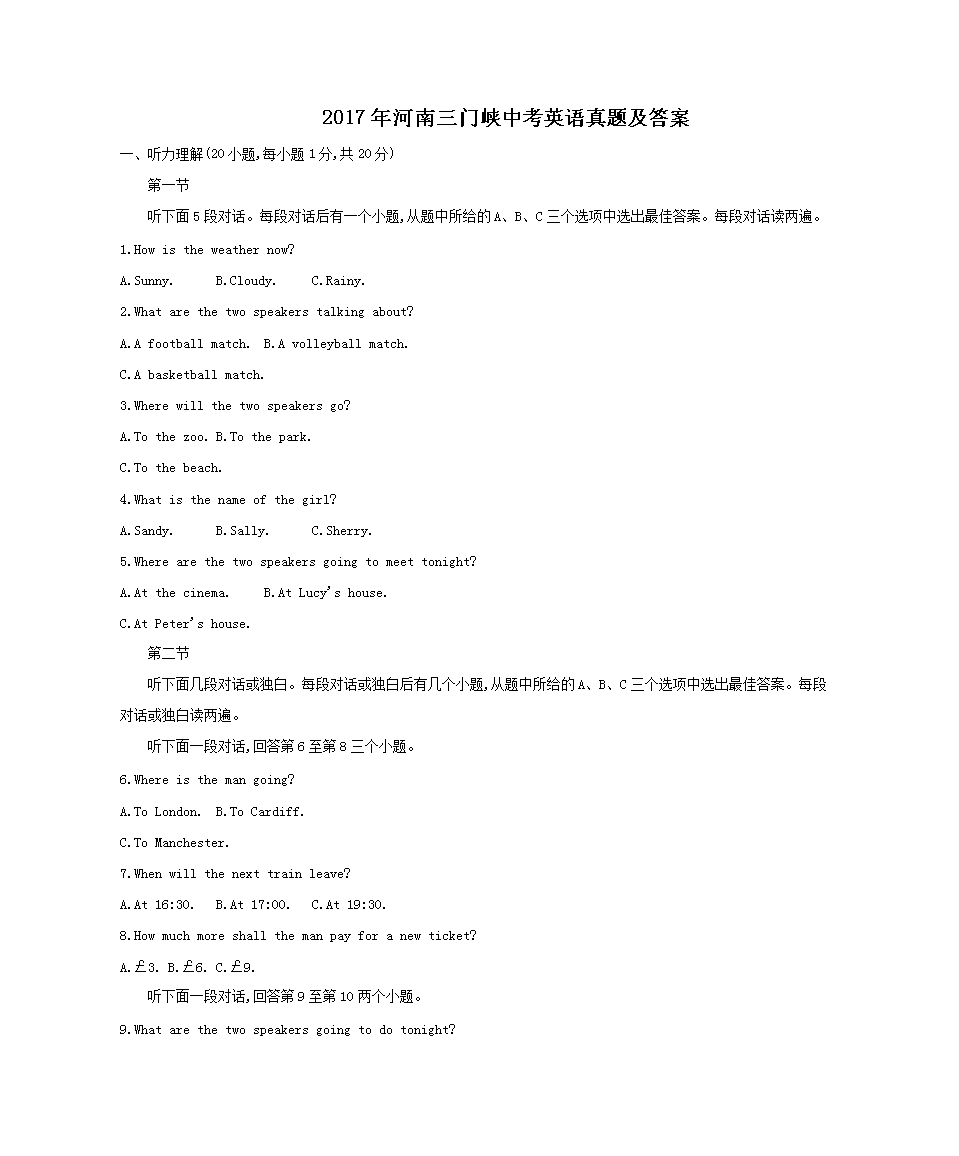 【文档名称】 2017年河南三门峡中考英语真题及答案(Word版).doc