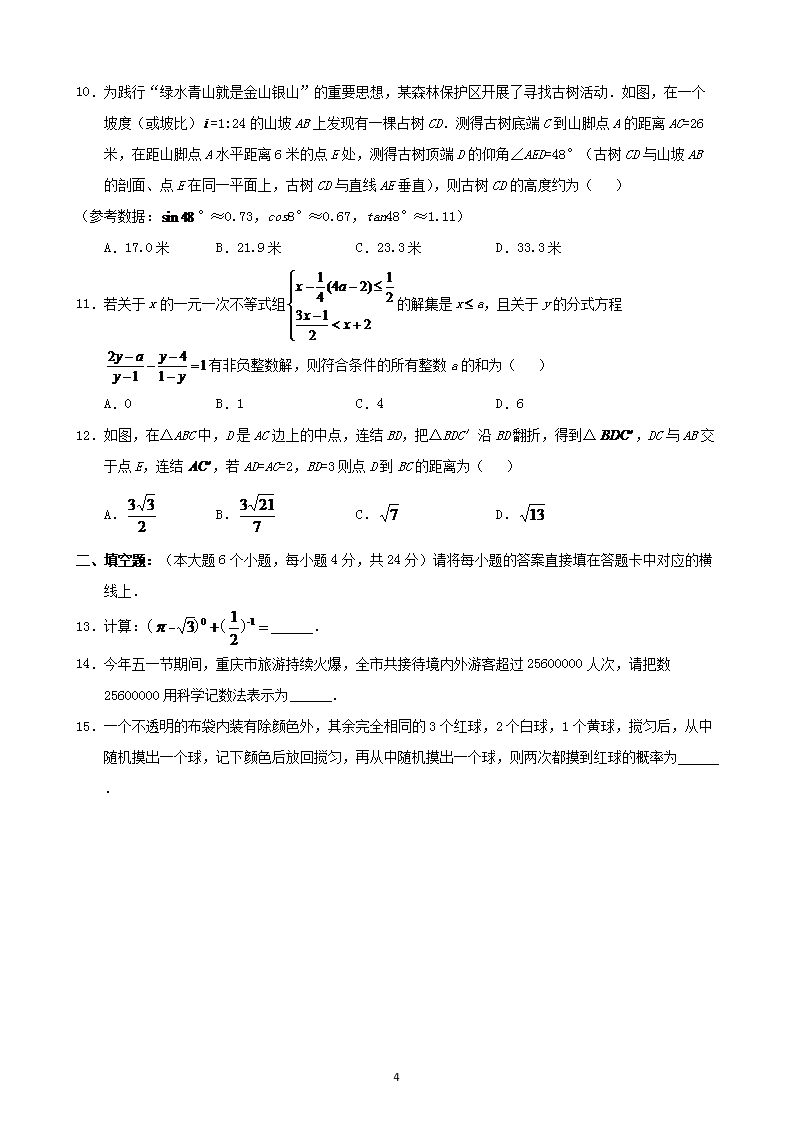【文档名称】 2019年重庆万州中考数学真题及答案A卷(Word版).doc