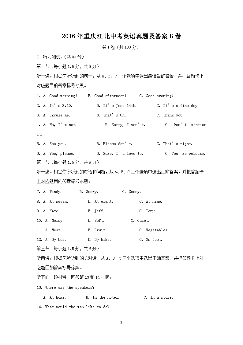 【文档预览】 无忧考网整理发布2016年重庆江北中考英语真题及答案B卷(Word版),前五页预览如下: