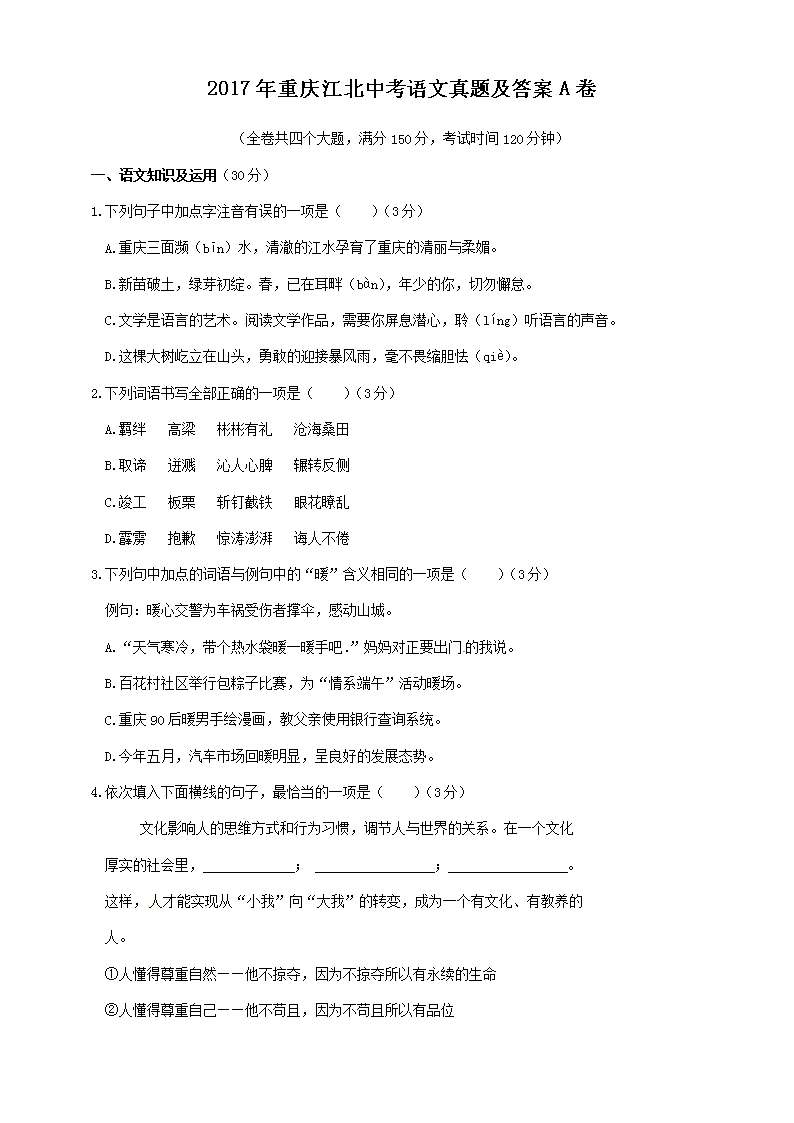【文档名称】 2017年重庆江北中考语文真题及答案A卷(Word版).doc
