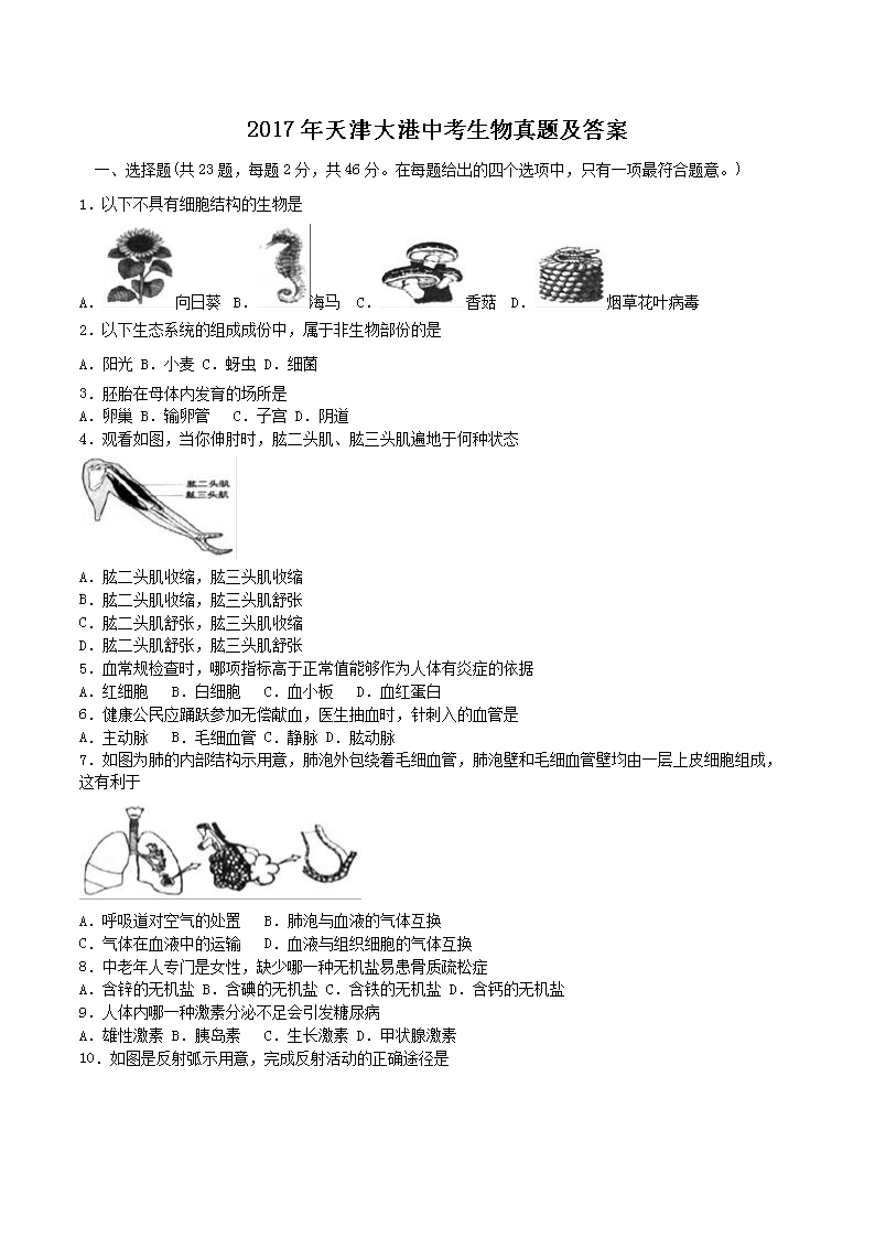 【文档预览】 无忧考网整理发布2017年天津大港中考生物真题及答案(Word版),前五页预览如下: