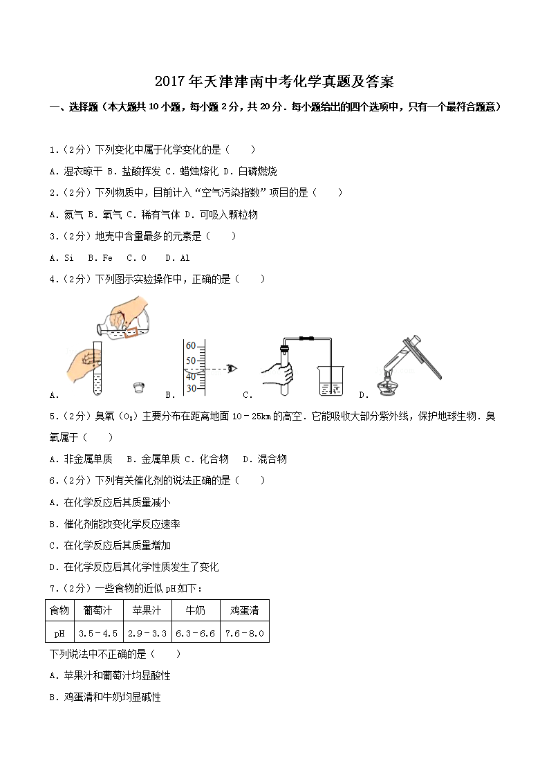 【文档预览】 无忧考网整理发布2017年天津津南中考化学真题及答案(Word版),前五页预览如下: