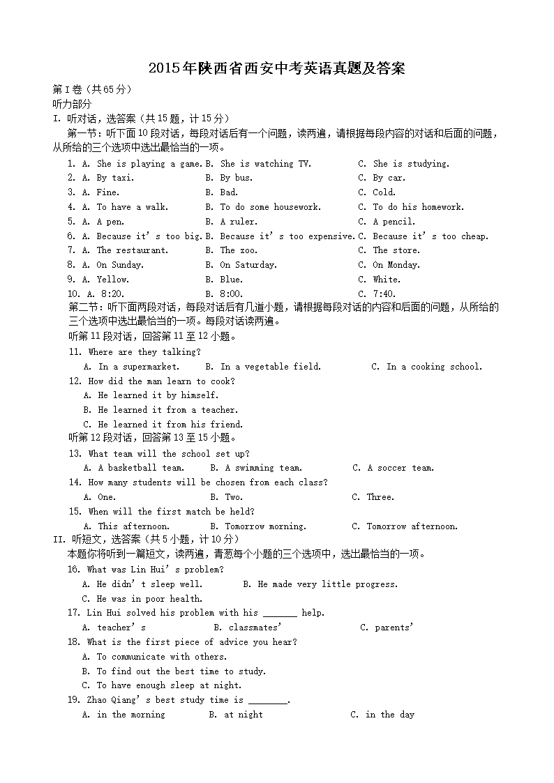 【文档名称】 2015年陕西省西安中考英语真题及答案(Word版).doc