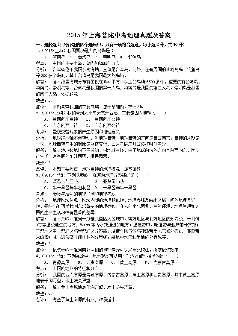 【文档名称】 2015年上海普陀中考地理真题及答案(Word版).doc