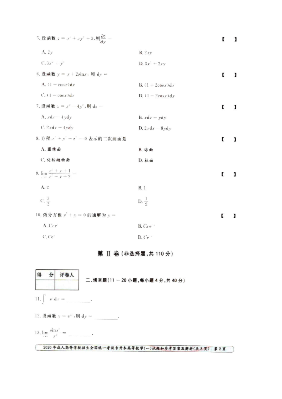 【文档名称】 2020年宁夏成人高考专升本高数(一)真题及答案(图片版).doc