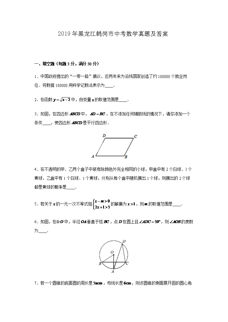 【文档名称】 2019年黑龙江鹤岗市中考数学真题及答案(Word版).doc