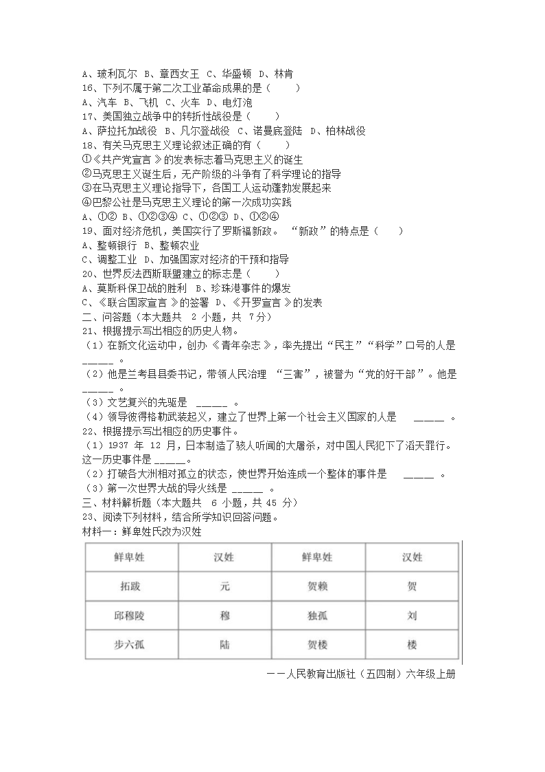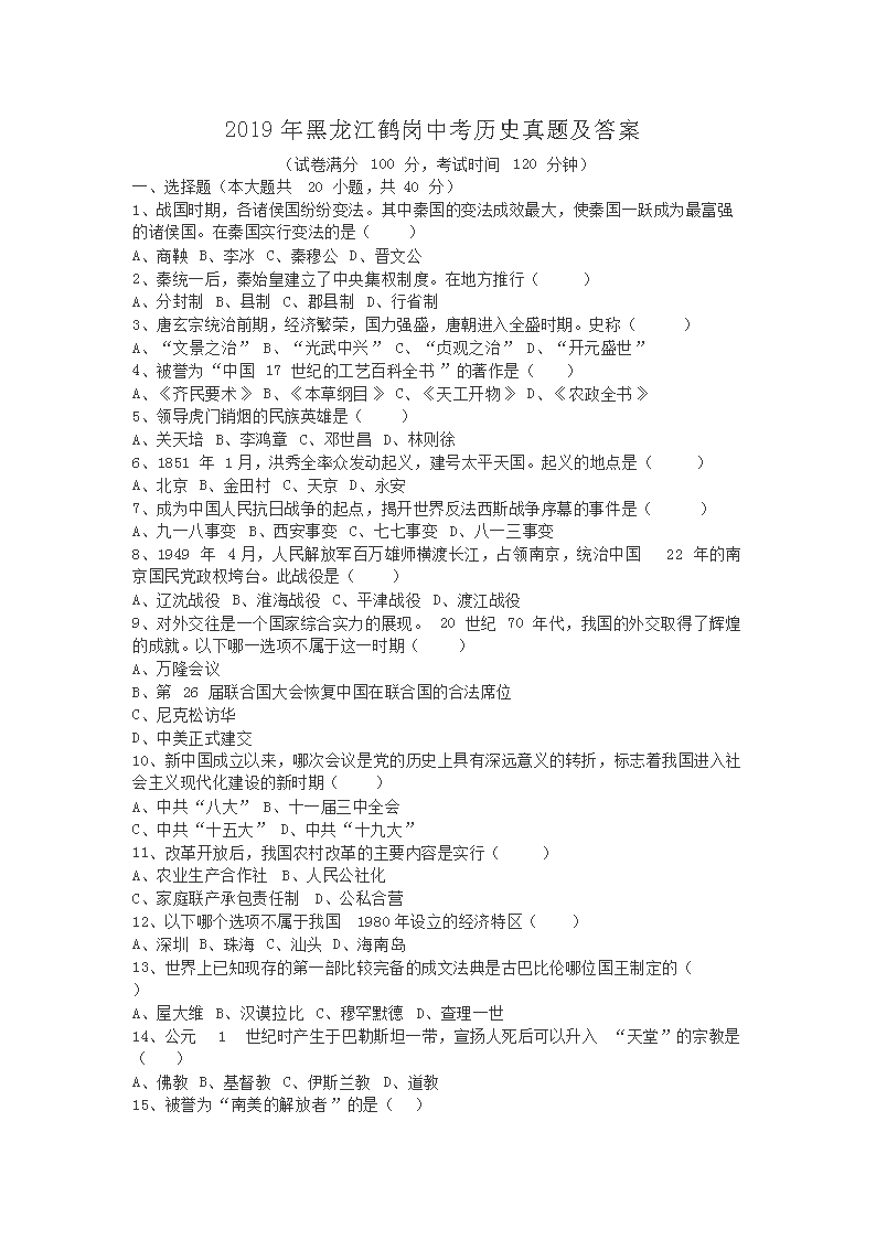 【文档名称】 2019年黑龙江鹤岗中考历史真题及答案(Word版).doc