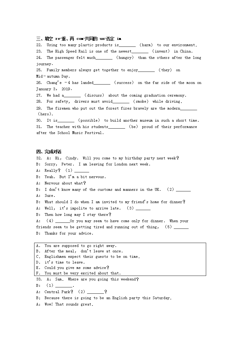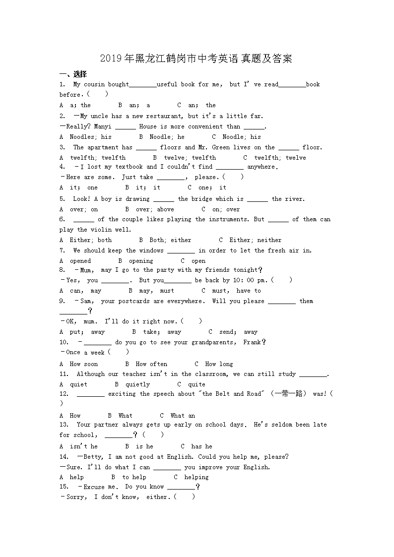 【文档名称】 2019年黑龙江鹤岗市中考英语真题及答案(Word版).doc