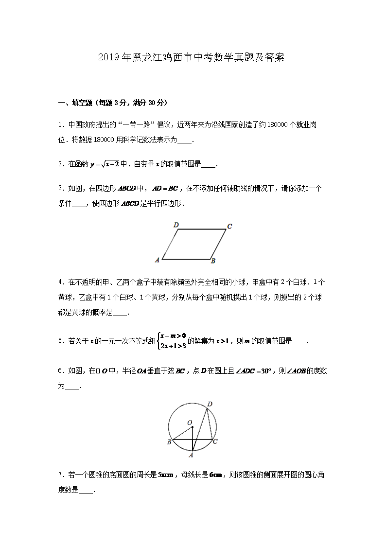 【文档预览】 无忧考网整理发布2019年黑龙江鸡西市中考数学真题及答案(Word版),前五页预览如下: