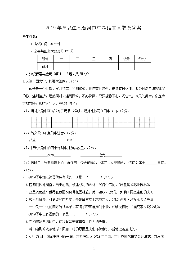 【文档名称】 2019年黑龙江七台河市中考语文真题及答案(Word版).doc