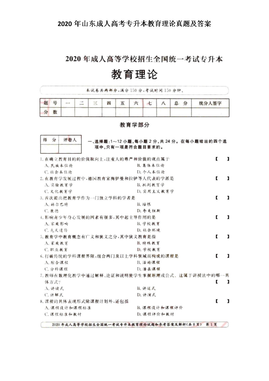 【文档名称】 2020年山东成人高考专升本教育理论真题及答案(图片版).doc