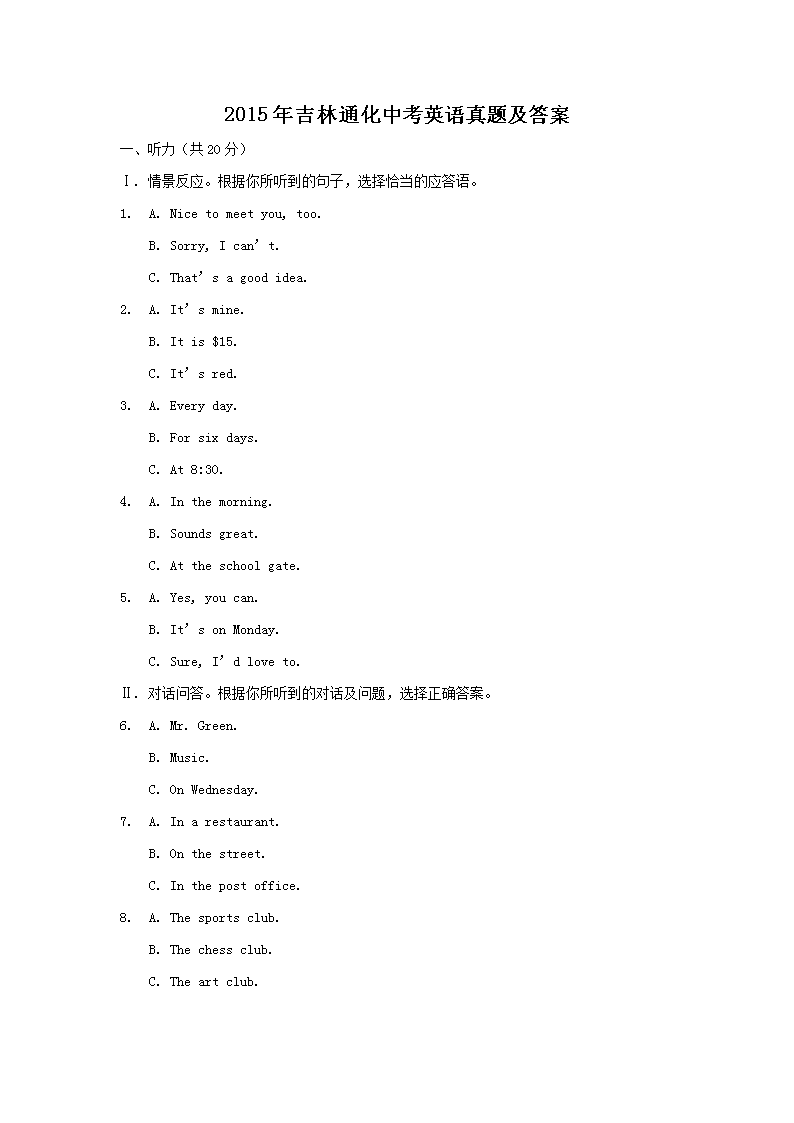【文档名称】 2015年吉林通化中考英语真题及答案(Word版).doc