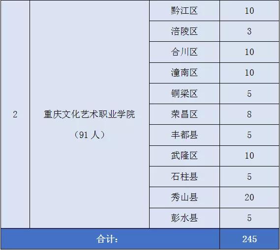 2021年重庆市面向全市应届初中毕业生招收学前教育公费师范生,为我市23个区县定向培养幼儿园教师245人,培养学制为5年,学历层次为专科。培养学校为重庆幼儿师范高等专科学校、重庆文化艺术职业学院。