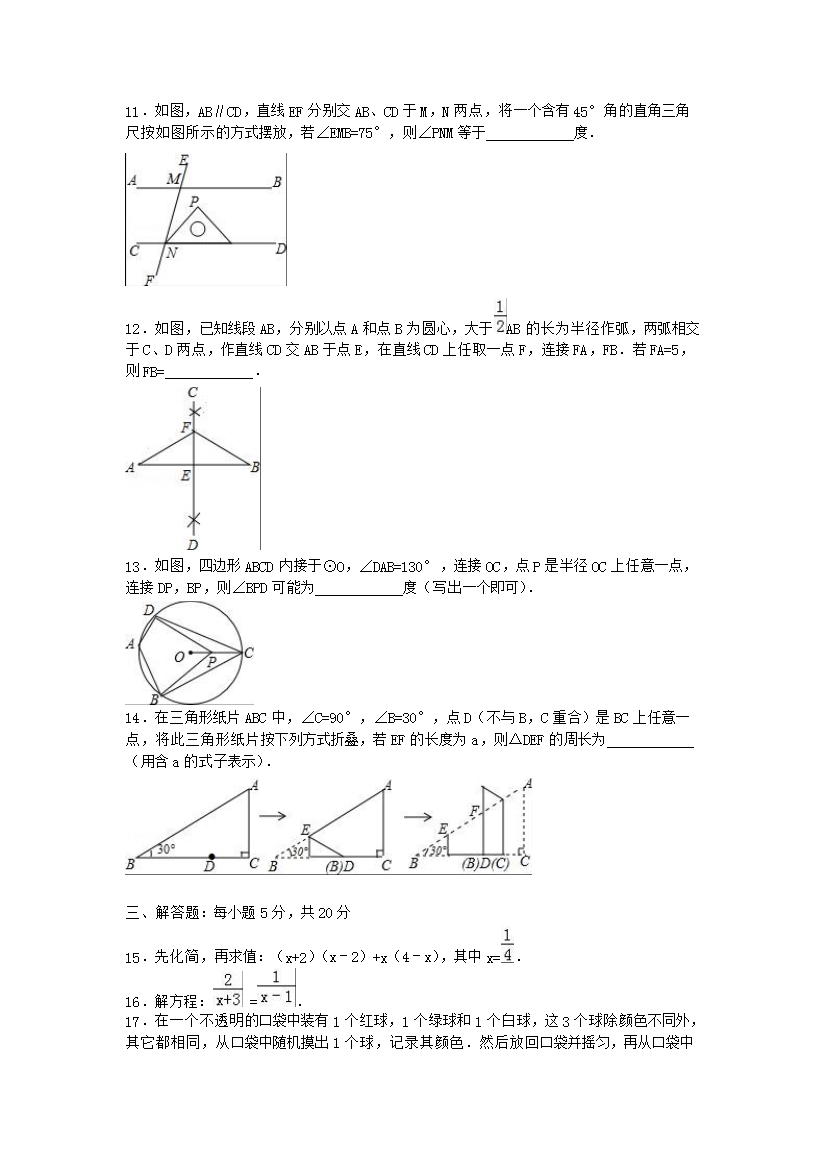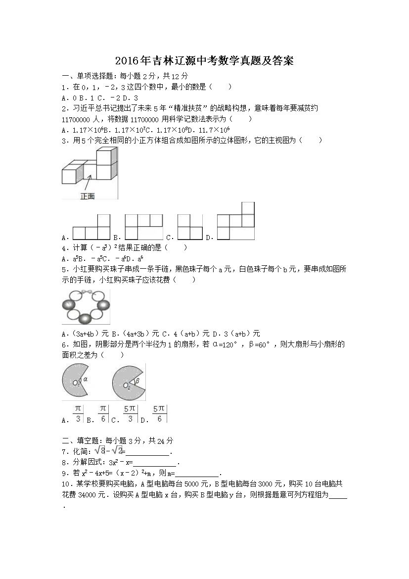 【文档名称】 2016年吉林辽源中考数学真题及答案(Word版).doc