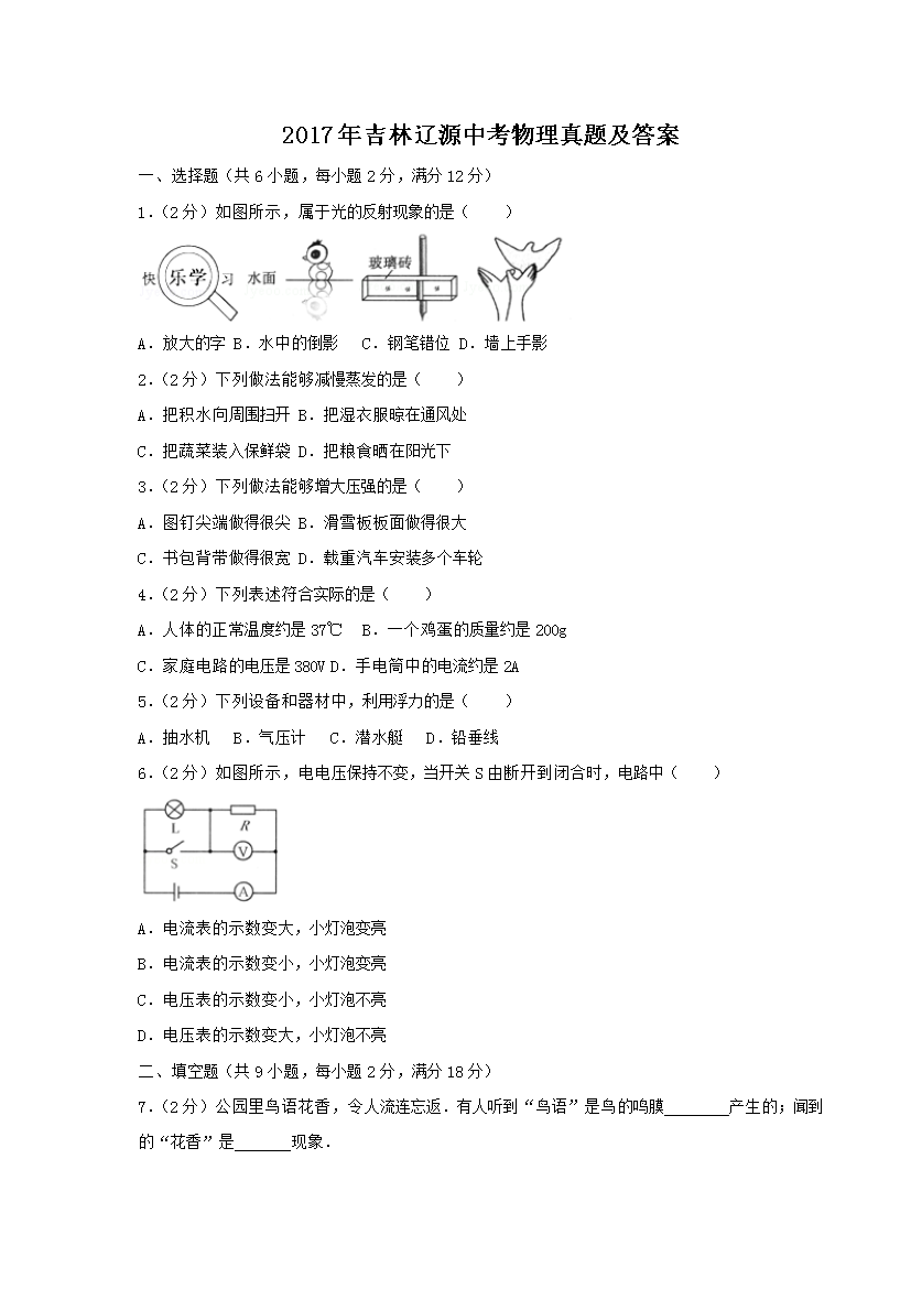 【文档名称】 2017年吉林辽源中考物理真题及答案(Word版).doc