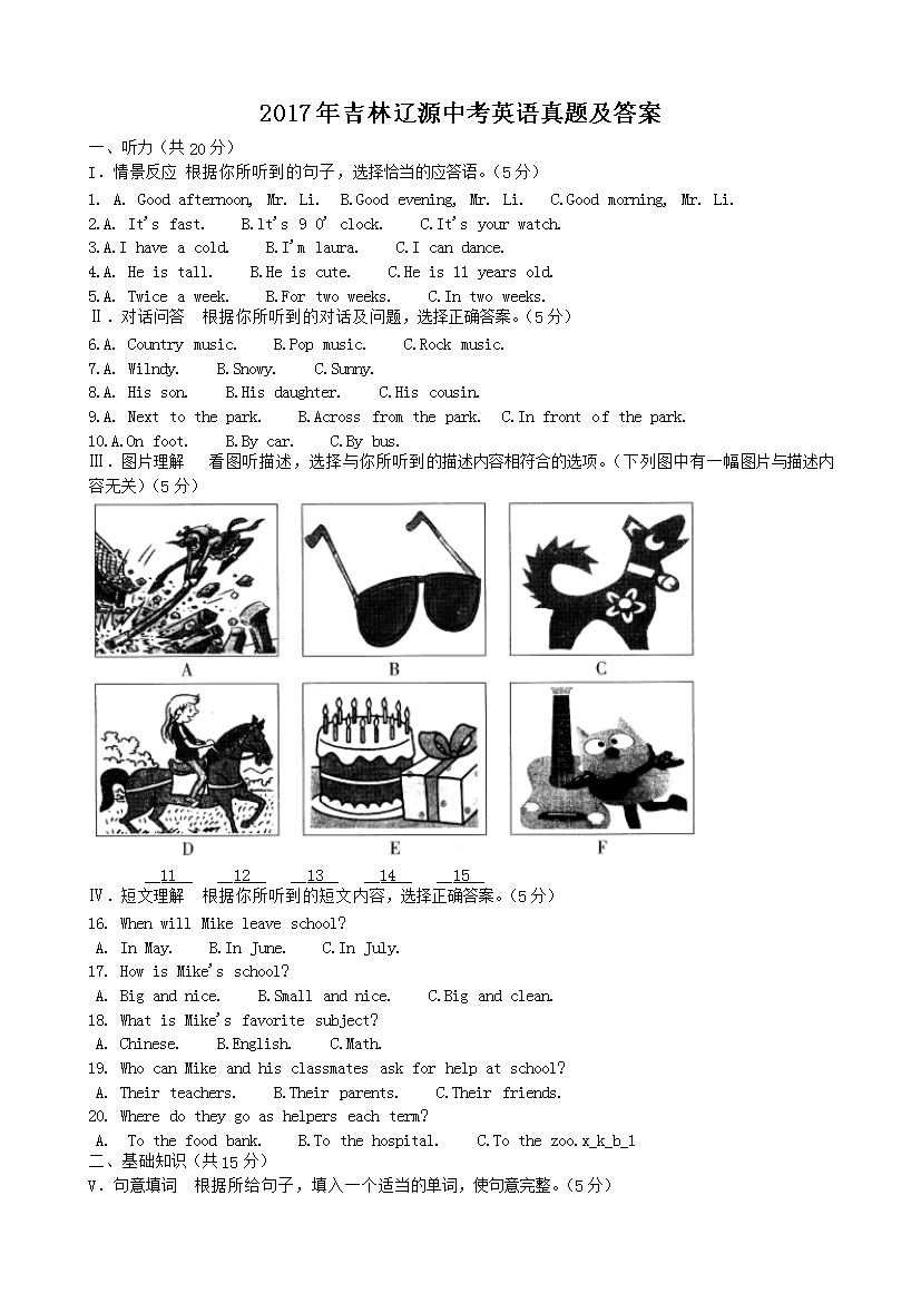 【文档名称】 2017年吉林辽源中考英语真题及答案(Word版).doc