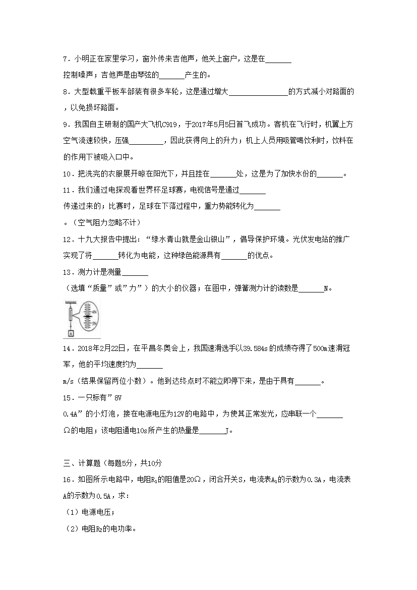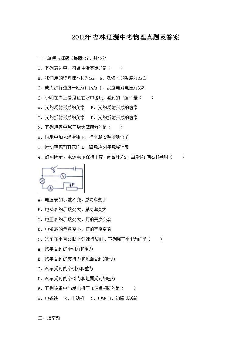【文档名称】 2018年吉林辽源中考物理真题及答案(Word版).doc