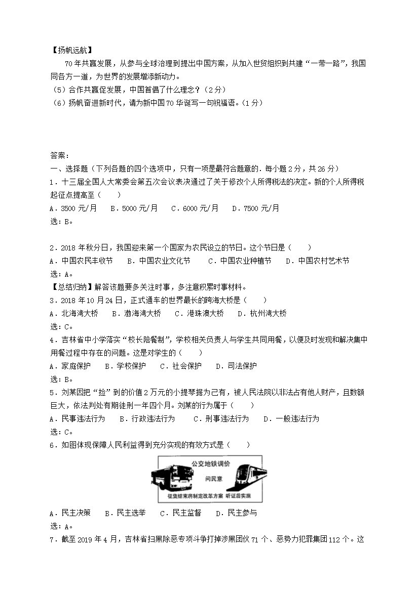 【文档名称】 2019年吉林辽源中考政治真题及答案(Word版).doc