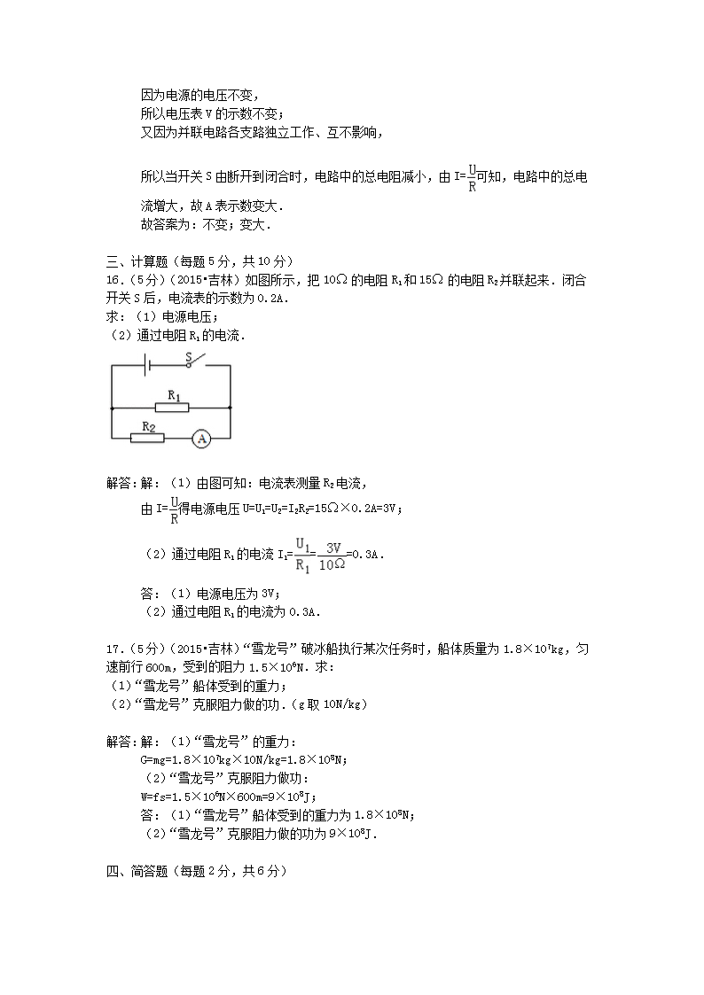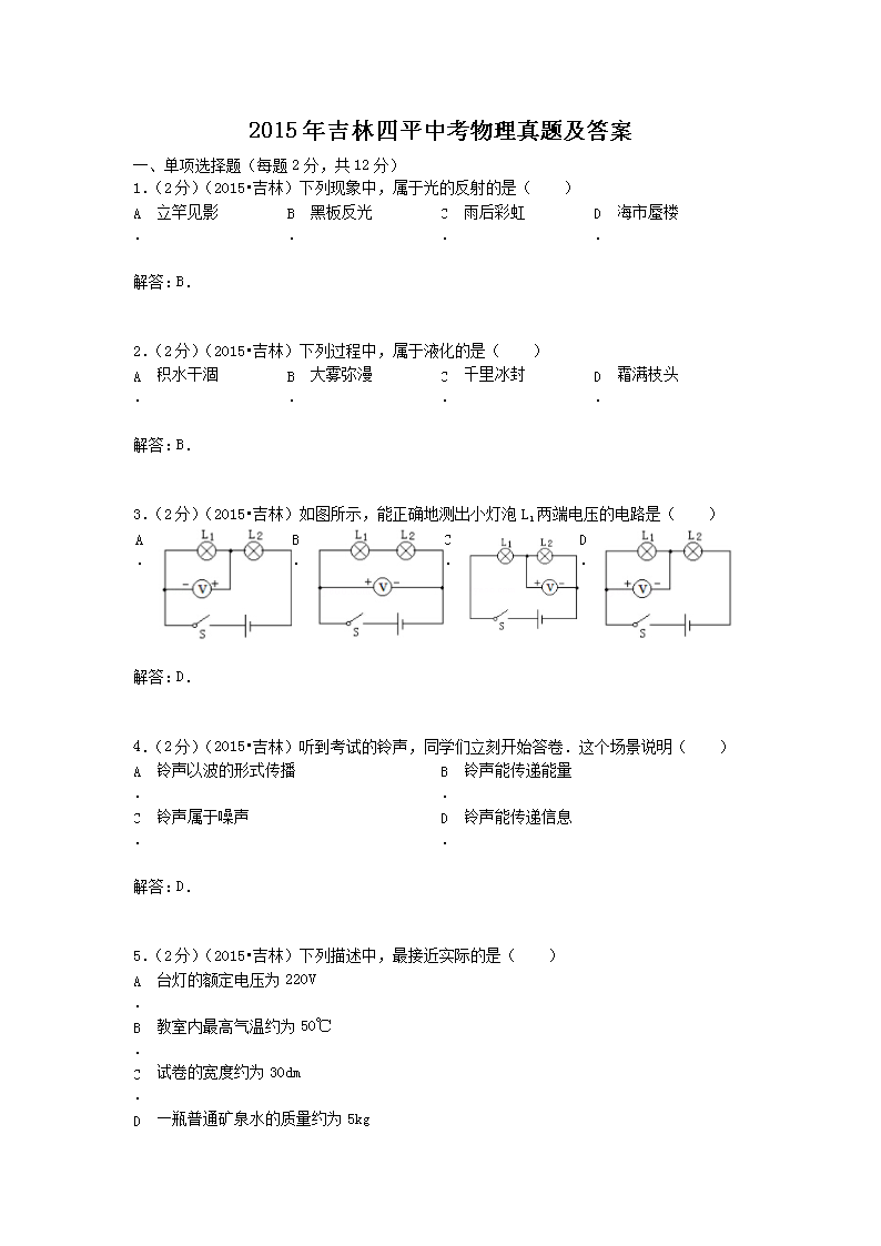 【文档名称】 2015年吉林四平中考物理真题及答案(Word版).doc