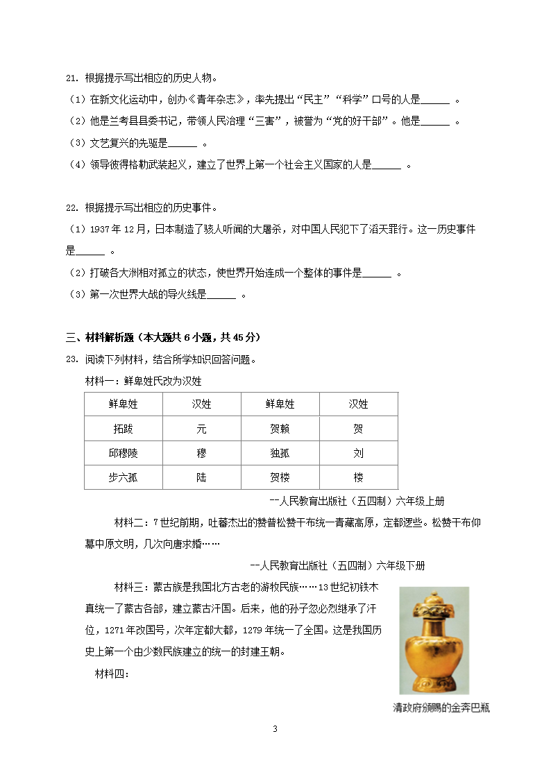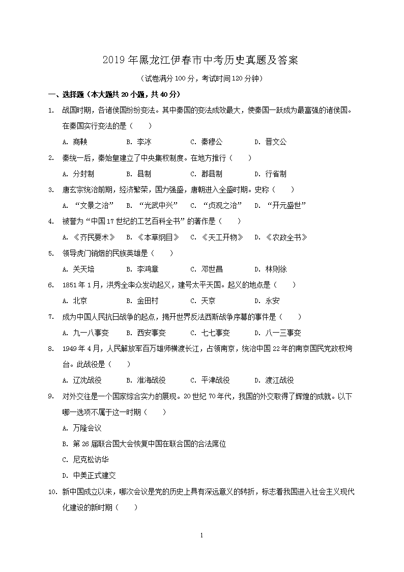 【文档名称】 2019年黑龙江伊春市中考历史真题及答案(Word版).doc