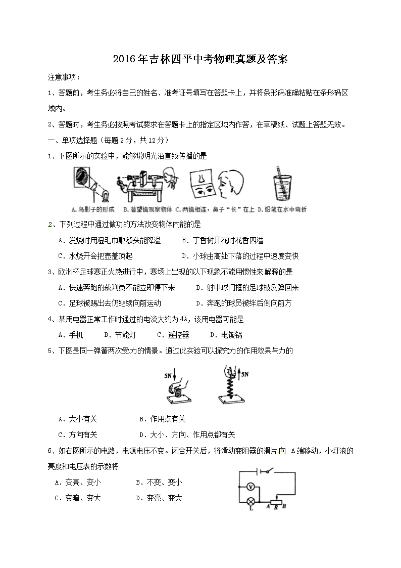 【文档预览】 无忧考网整理发布2016年吉林四平中考物理真题及答案(Word版),前五页预览如下:
