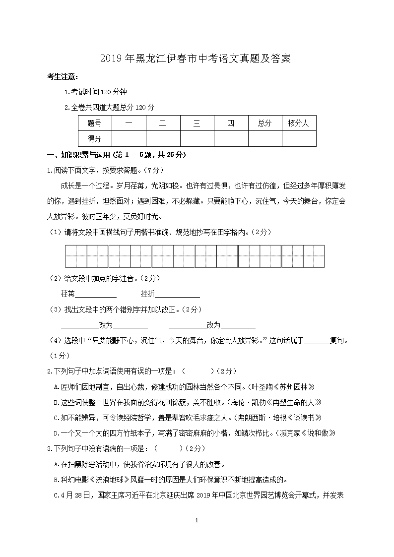 【文档名称】 2019年黑龙江伊春市中考语文真题及答案(Word版).doc