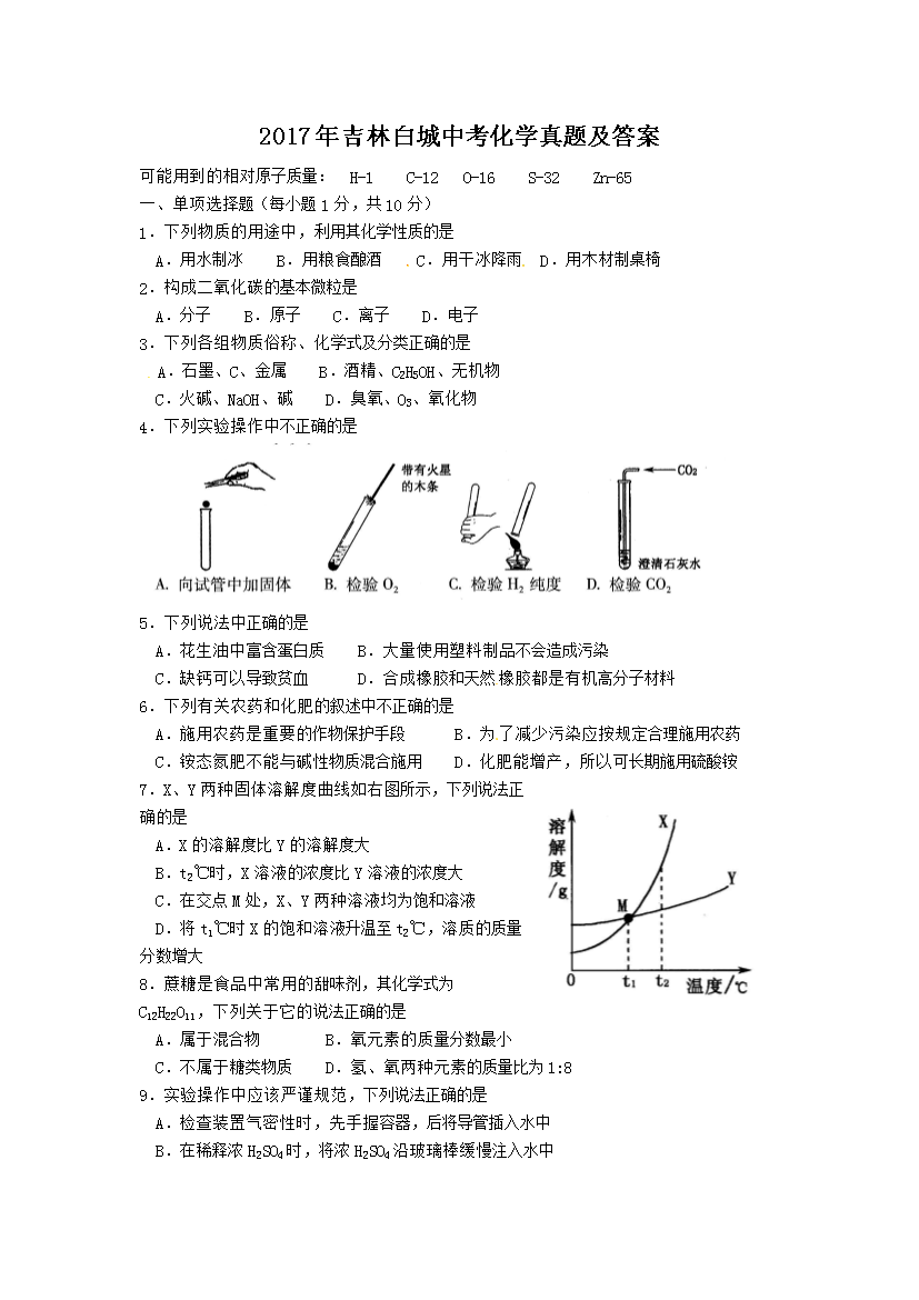 【文档名称】 2017年吉林白城中考化学真题及答案(Word版).doc