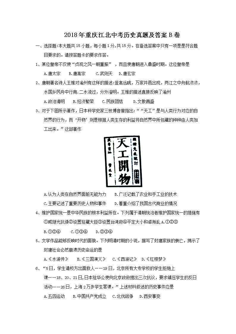 【文档名称】 2018年重庆江北中考历史真题及答案B卷(Word版).doc