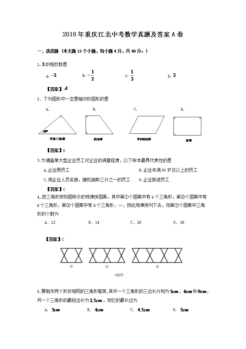 【文档名称】 2018年重庆江北中考数学真题及答案A卷(Word版).doc