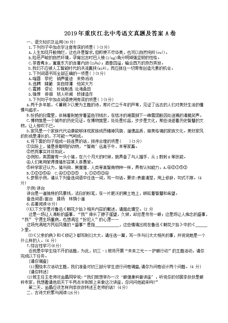 【文档名称】 2019年重庆江北中考语文真题及答案A卷(Word版).doc