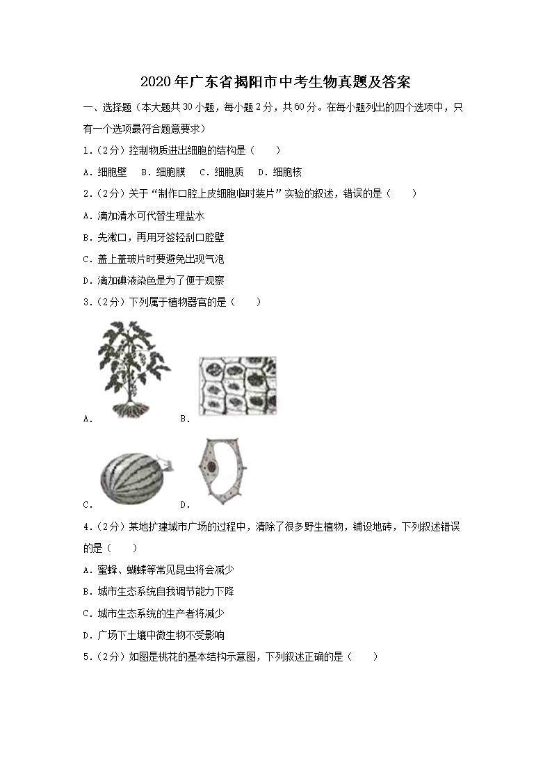 【文档预览】 无忧考网整理发布2020年广东省揭阳市中考生物真题及答案(Word版),前五页预览如下:
