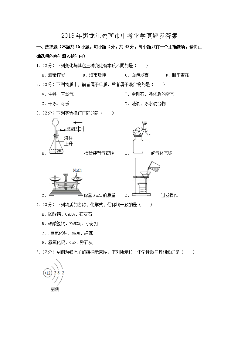 【文档名称】 2018年黑龙江鸡西市中考化学真题及答案(Word版).doc