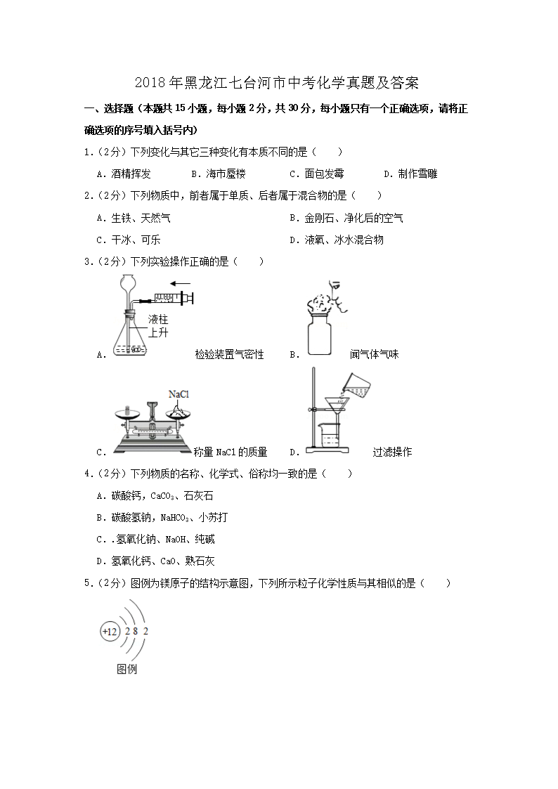【文档名称】 2018年黑龙江七台河市中考化学真题及答案(Word版).doc