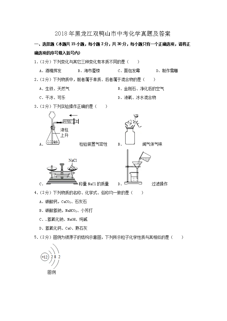 【文档预览】 无忧考网整理发布2018年黑龙江双鸭山市中考化学真题及答案(Word版),前五页预览如下: