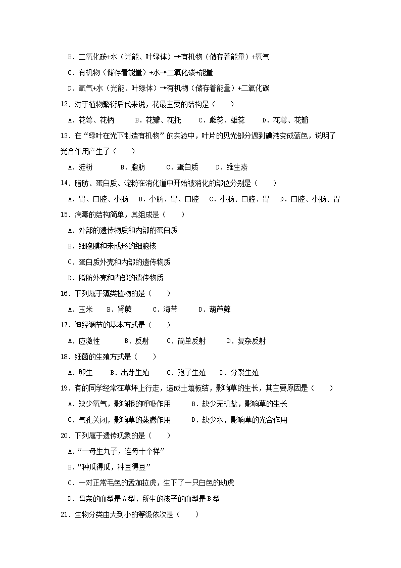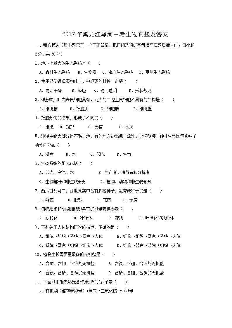 【文档预览】 无忧考网整理发布2017年黑龙江黑河中考生物真题及答案(Word版),前五页预览如下: