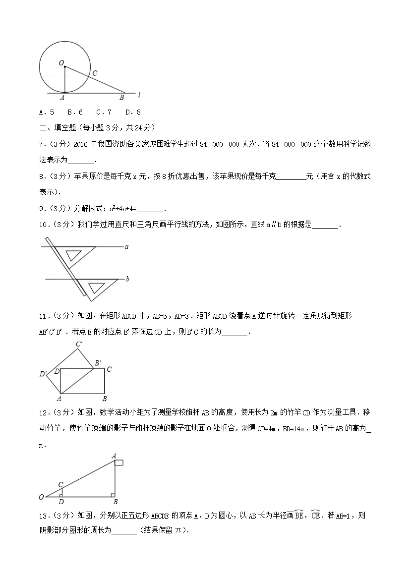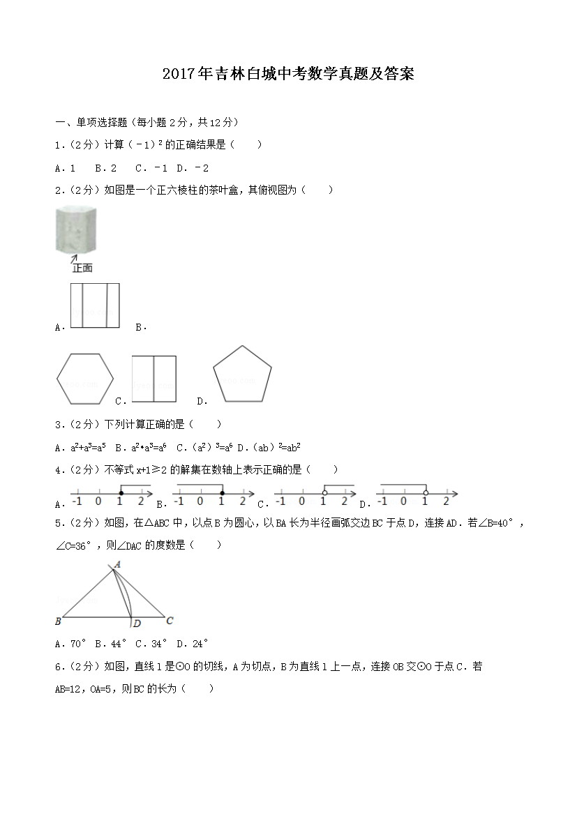 【文档名称】 2017年吉林白城中考数学真题及答案(Word版).doc