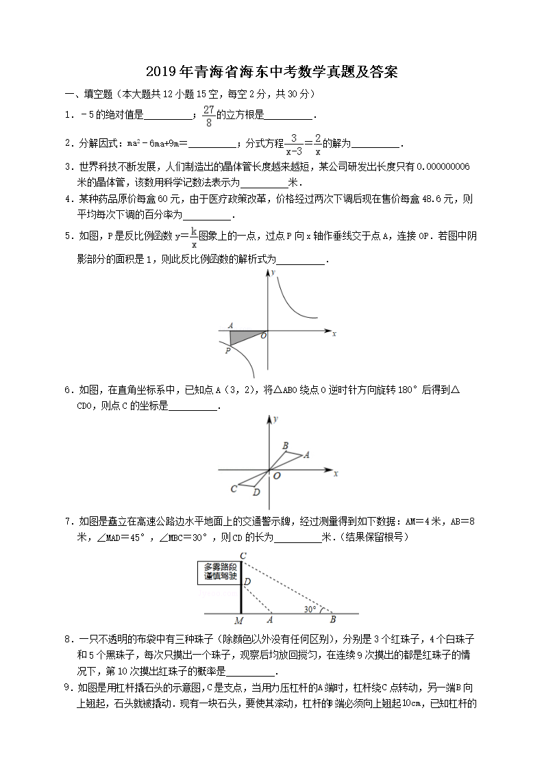 【文档名称】 2019年青海省海东中考数学真题及答案(Word版).doc
