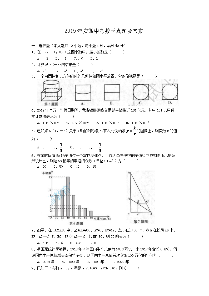 【文档名称】 2019年安徽中考数学真题及答案(Word版).doc